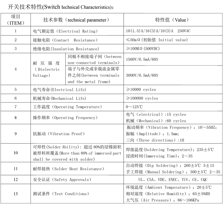 | 1 | Електричний рейтинг | 10(1,5)A/16(3)A/10(3)A 250VAC | |