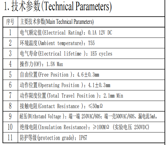 | 1 | Електричний рейтинг | 0,1a 12VDC | |